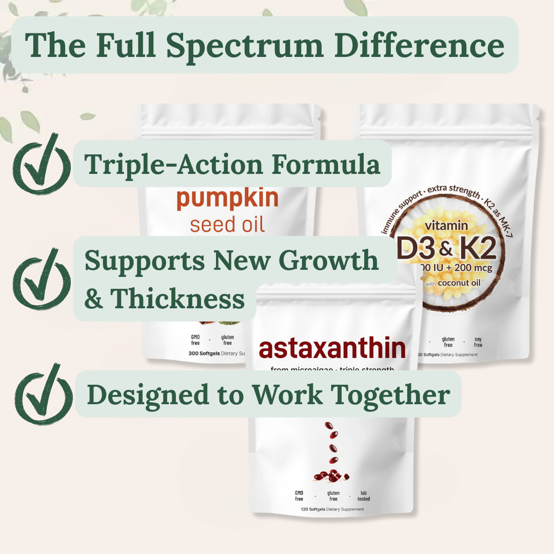 Our bundle addresses all three mechanisms simultaneously: astaxanthin protects follicles from cellular damage, pumpkin seed oil balances DHT (the hormone that shrinks follicles), and vitamin D3+K2 optimizes the nutrients your body needs for healthy hair cycles. That's why it works when single-ingredient supplements don't.