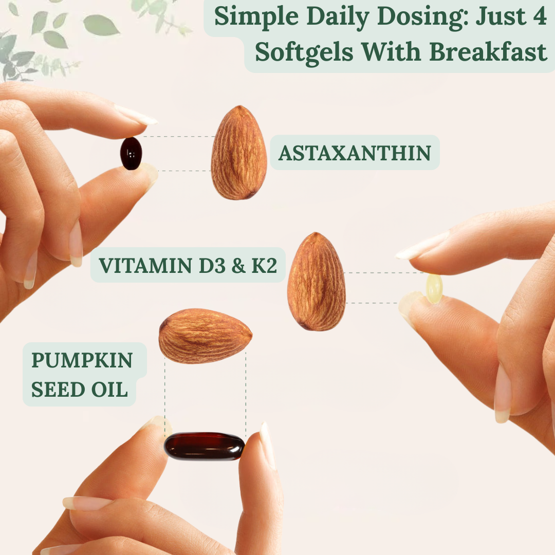 At 12mg, our triple-strength astaxanthin protects follicles from oxidative damage. But hair loss isn't just about antioxidants. That's why we bundled it with pumpkin seed oil and D3+K2—complete support for less than you'd pay for astaxanthin alone elsewhere.